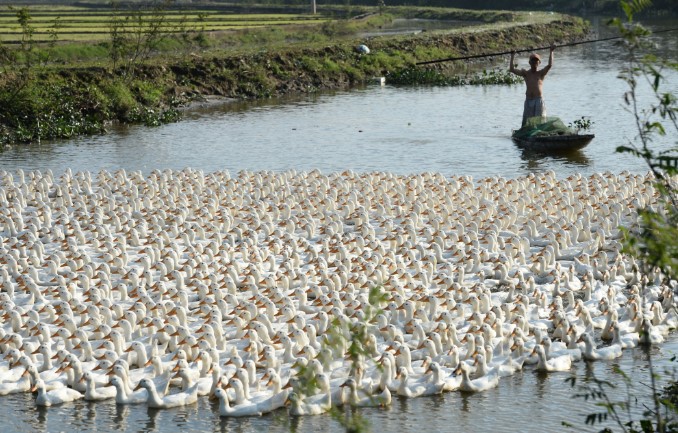 越南順化附近的一條運河上,一位農夫在放養他的鴨子羣。