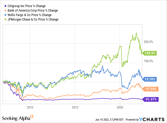 There's always an "on-the-other-hand". Citi is now ridiculously cheap in comparison to the market as a whole and other banks of similar size. Its P/E ratio of about 7.5 is around 30% lower than the P/E ratios of Bank of American (BAC) and Wells Fargo (WFC), both of which are about 10.5, and a bit lower than that by comparison with JPMorgan (JPM), which as the leader of the four major banks may be entitled to at least a small premium. A lower P/E implies that the market requires a cheaper price to entice buyers of the stock. Inversely, the dividend yield of C, above 4%, is the cash return the market requires compared to about 2.5% for BAC and WFC and 3.13% for JPM, which has a higher payout ratio. Here are two comparison charts for the four major banks, the first going back to 2007 and the second for the past year: