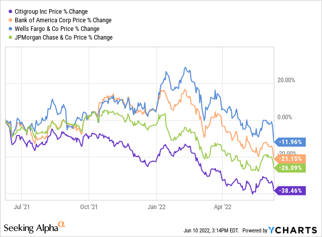 If nothing else, Citi is by far the cheapest major bank, and in an environment which may be much more favorable for large banks than the market realizes, may position Citi for a huge bounce off whatever lows it reaches in the present down market. Because of its low P/E ratio it might be argued that Citi is likely to fall less than other banks if the market continues to tank and then bounce higher faster as the market recovers. Its dividend may also provide some protection, and if all is well with its stress test results (to be announced June 26) it should be able to carry out large share buybacks at a price making them very accretive to continuing shareholders.