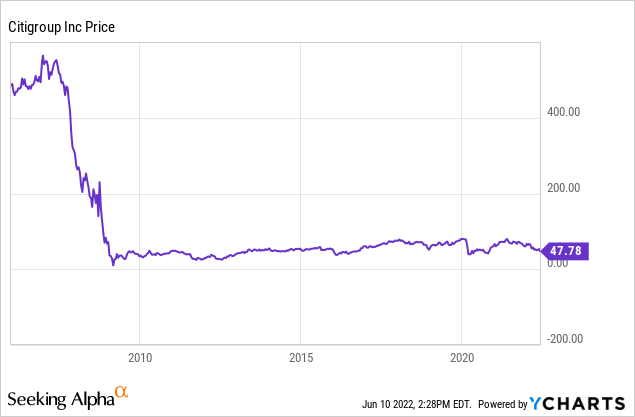 Over the years Citigroup has acquired a reputation as the worst major U.S. bank. In the housing/credit default swap financial crisis of 2007-2009 it was the biggest loser, and not coincidentally the biggest miscreant. Then-CEO Charles Prince ignored the report of a senior executive who ultimately became a whistleblower. Citi received a major government bailout which came with partial government ownership and supervision. Its stock fell to a price below $1 and it was still trading around $4 when on May 9, 2011, it executed a one for ten stock split. That raised its stock price to a respectable $40. For shareholders that reduced the number of shares owned by a factor of 10 so the reverse split didn't help. However, it enabled Citi to resume paying dividends at a rate of $0.01 (yes, that's one penny). The split was actually carried out after C stock had quadrupled off the bottom. If you think that the $40 price isn't very different from the current price you are absolutely right. To be scrupulously fair, Citi stock traded at a price around $80 three times in recent years, in 2018, 2020, and 2021, before falling steadily in 2022 to its present price around $47. That's not a lot of progress to make for more than a decade. Here's how that looks on a chart: