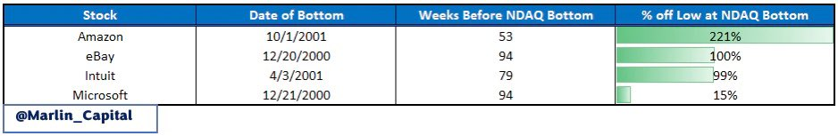 For example, David Marlin noted:Not all stocks bottom at the same time. When you go back and study previous Bear Market bottoms, this becomes even more evident. The tide seems to be turning. The Dot Com Bust, in particular, has been a great study throughout this Bear. $Amazon.com(AMZN)$ ,$Microsoft(MSFT)$ ,$eBay(EBAY)$ ,$Intuit(INTU)$ saw bottom up with different weeks before NASDAQ bottom.