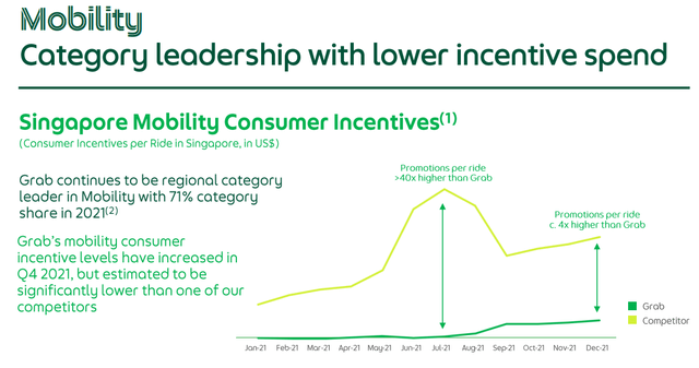 We perceive Grab's game plan as outcompeting competitors for market share and then lower incentives to boost profitability. According to Euromonitor, Grab is already leading the market with good margins. Should Grab continue its growth trajectory while consumer incentive shows signs of normalization in 2022Q2, profitability is in sight.