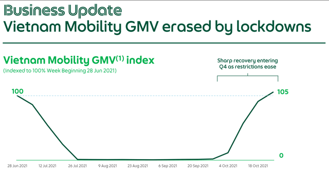 In hindsight, this decision not to price in any material recovery in Grab's mobility segment proved to be the right call. For instance, Grab's gross merchandise value (GMV) shrunk in 2021Q3 as Grab's mobility GMV in Vietnam got erased due to the region's COVID lockdown (Fig 1).