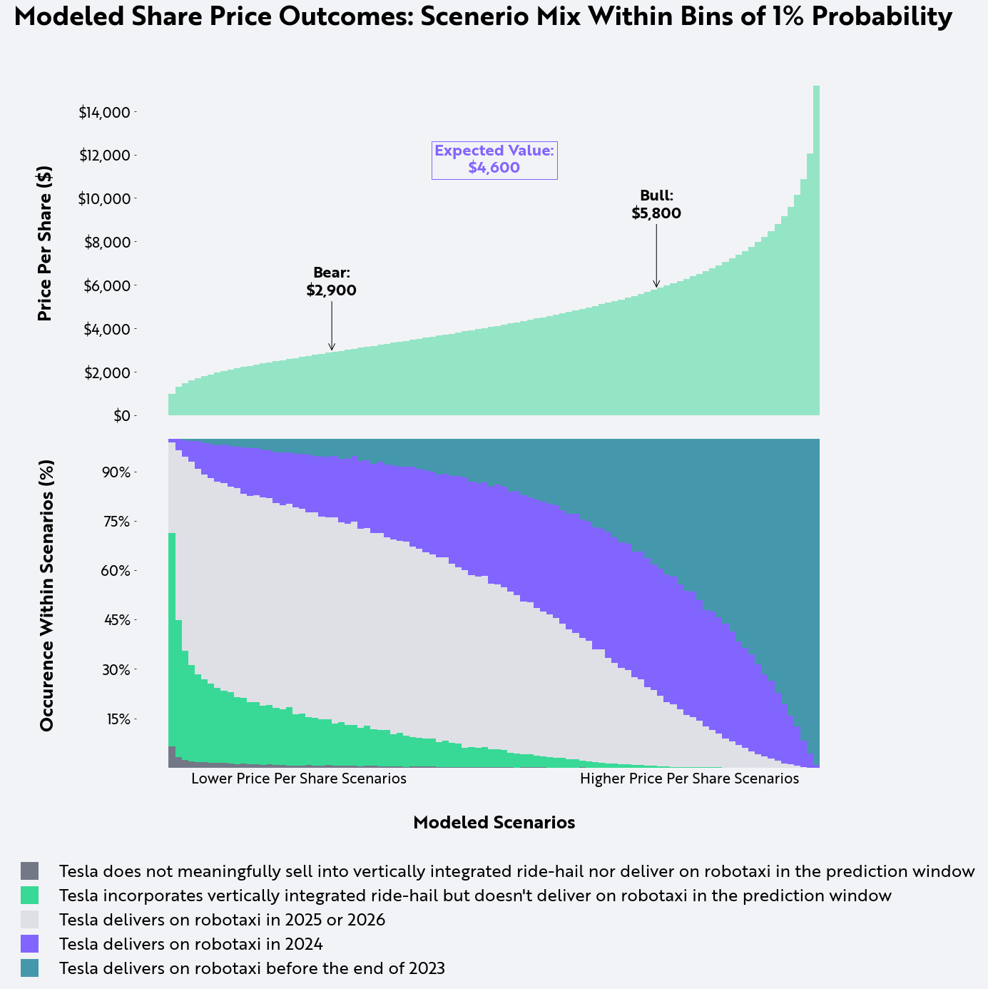 The simulation is highly sensitive to the year in which Tesla launches robotaxis, as shown in the charts below. The upper chart represents the likely distribution of all possible price targets from our Monte Carlo analysis and identifies the bear and bull cases as the 25th and 75th percentile outcomes, respectively. “Expected value” is the average of all 1 million simulations.