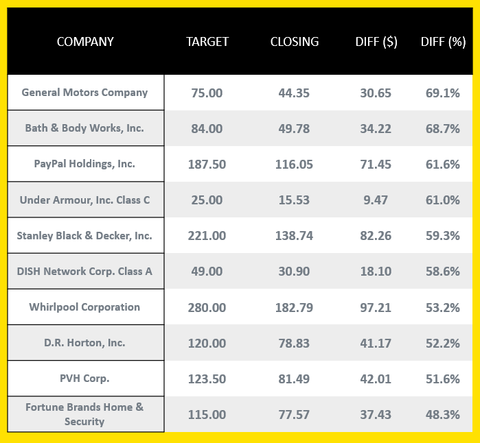 Top 10 List According to the Difference Between Median Target Price & Closing Price: $General Motors(GM)$ ,$Bath & Body Works Inc.(BBWI)$$PayPal(PYPL)$ ,$Under Armour(UA)$ ,$Stanley Black & Decker(SWK)$ ,$DISH Network Corp. Rights(DISHR)$ ,$Whirlpool(WHR)$ ,$D.R. Horton(DHI)$ ,$PVH Corp(PVH)$ ,$Fortune Brands Home & Security(FBHS)$ .