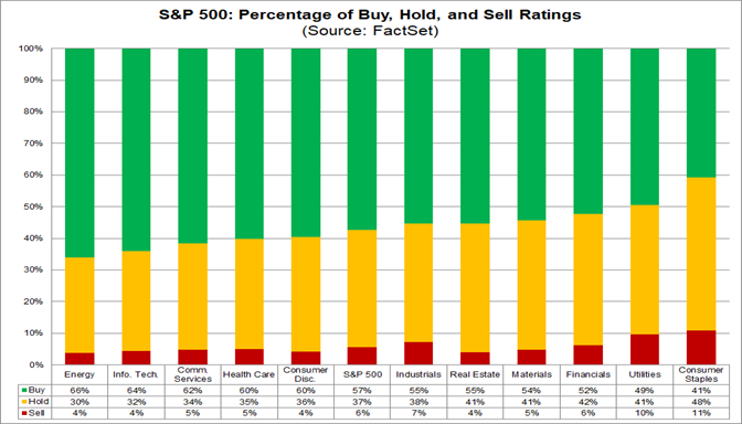 On the other hand, analysts are most pessimistic on the Consumer Staples (41%) and Utilities (49%) sectors, as these two sectors had the lowest percentage of Buy ratings on March 31. The Consumer Staples sector also had the highest percentage of Hold ratings (48%) and the highest percentage of Sell ratings (11%) on this date.