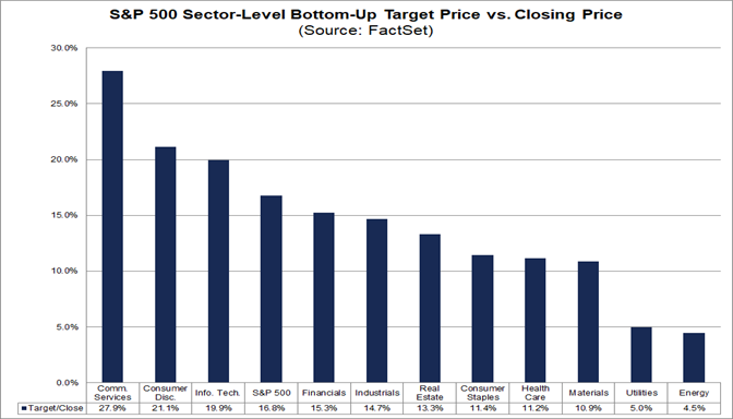 At the sector level, the Communication Services (+27.9%), Consumer Discretionary (+21.1%), and Information Technology (+19.9%) sectors are expected to see the largest price increases, as these three sectors had the largest upside differences between the bottom-up target price and the closing price on March 24.