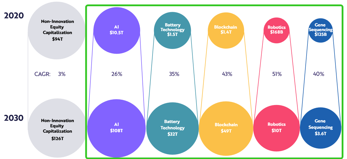 Precisely, AI Innovation Will Increase to More Than $100 Trillion In Equity Market Capitalization, Battery Technology Will Generate More Than $30 Trillion, Robotics Advances Could Generate More Than $10 Trillion, Genomic Technologies Could Drive More Than $3 Trillion, Blockchain Could Command Nearly $50 Trillion In Equity Market Capitalization.