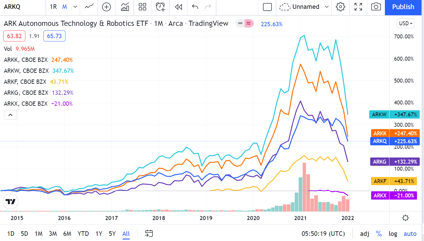 There are six active ETFs under ARK's Management: $(ARKQ)$, $(ARKK)$, $(ARKW)$, $(ARKF)$, $(ARKG)$, $(ARKX)$.