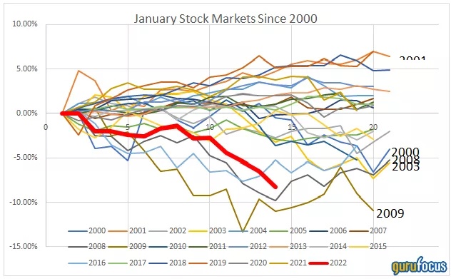 The graph below shows the stock market movement in January for all years since 2000. January 2022 is marked with a thick red line.