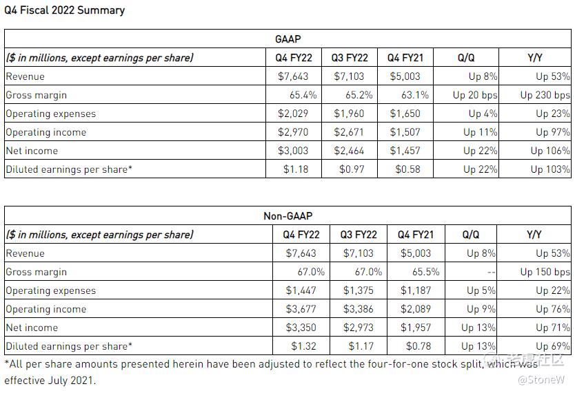 Hello everyone, I'm Stone.On February 17, 2022, $英伟达(NVDA)$ announced its fourth quarter earnings for fiscal 2022 (2022Q4), with net income up 125% year-over-year, 53% year-over-year and 8% year-over-quarter.