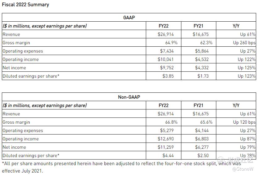 - Revenue for fiscal 2022 hit a record $26.91 billion, up 61 percent from $16.68 billion a year earlier.GAAP earnings per diluted share were $3.85, up 123% from $1.73 a year earlier.Non-gaap earnings per diluted share were $4.44, up 78% from $2.50 a year earlier.