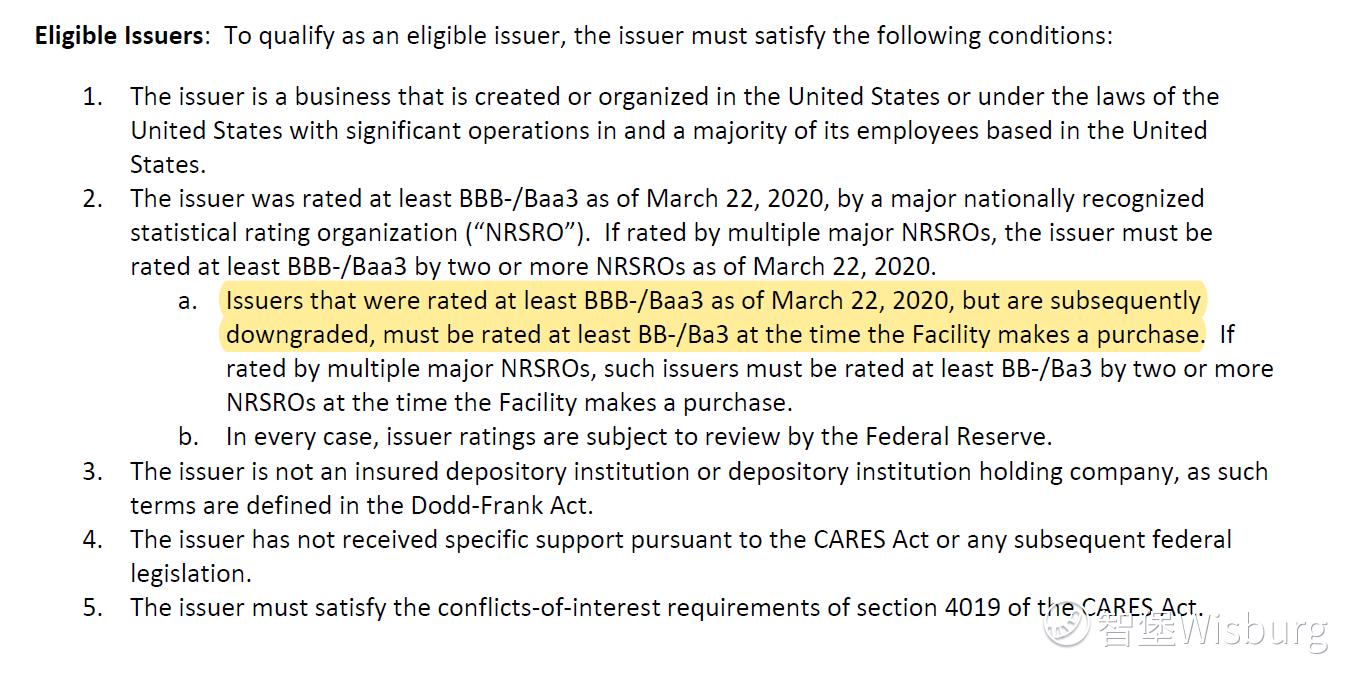 不過,需要注意的是,美聯儲並非爲垃圾債市場全面兜底,而只是爲了接住“墮落天使” (投資級降低至垃圾級) 而採取的技術調整。根據美聯儲公佈的條款,其購買BB級企業債的條件是:在3月22日之前,評級需在BBB-級 (投資級中評級最低的一檔) 及以上,而隨後跌落至垃圾級後,評級也需要在BB-級以上 (圖)。這對於本來初始評級就是垃圾級的債權利好有限,尤其是苦苦掙扎的頁岩油公司。
