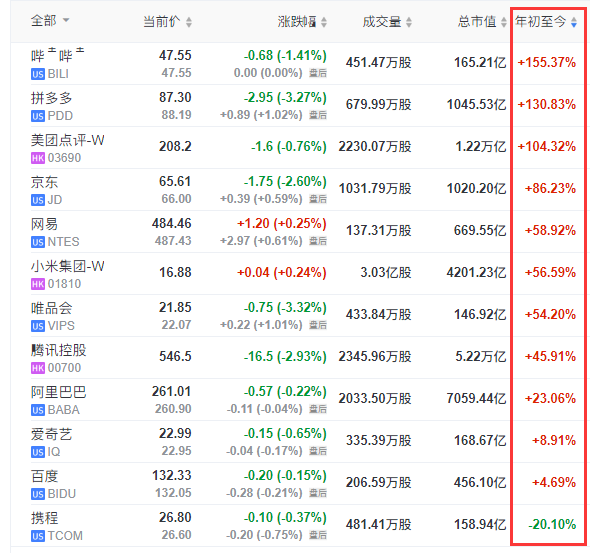 中概股“金陵十二釵”今年以來漲幅排行榜