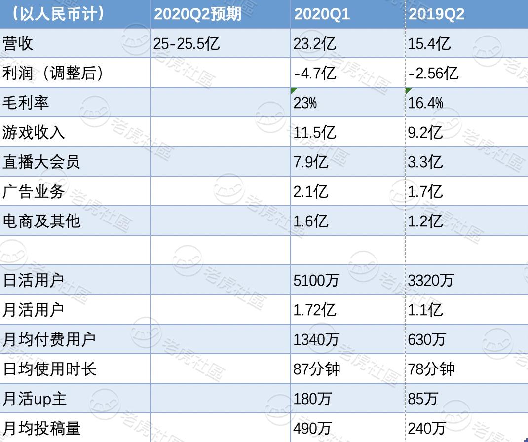 嗶哩嗶哩的Q1財報中,對2020年第二季度收入進行了展望,預計爲25.0億元至25.5億元人民幣。
