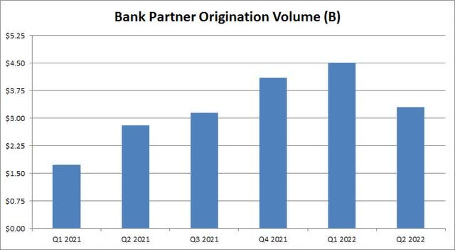 As the graphic below shows, bank partner origination volume fell sequentially in Q2 by more than a billion dollars, almost erasing the prior two quarters of meaningful growth.