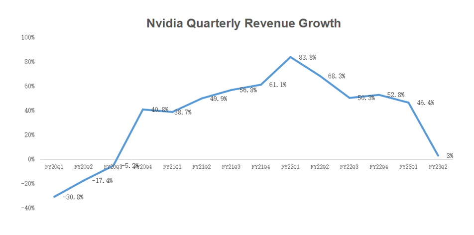 In the 2Q FY 2023, NVIDIA reported total revenue of $6.7 billion, significantly lower than the company's guidance of $8.1 billion, with a yoy growth of only 3%, far lower than the 46% growth rate in the previous quarter.