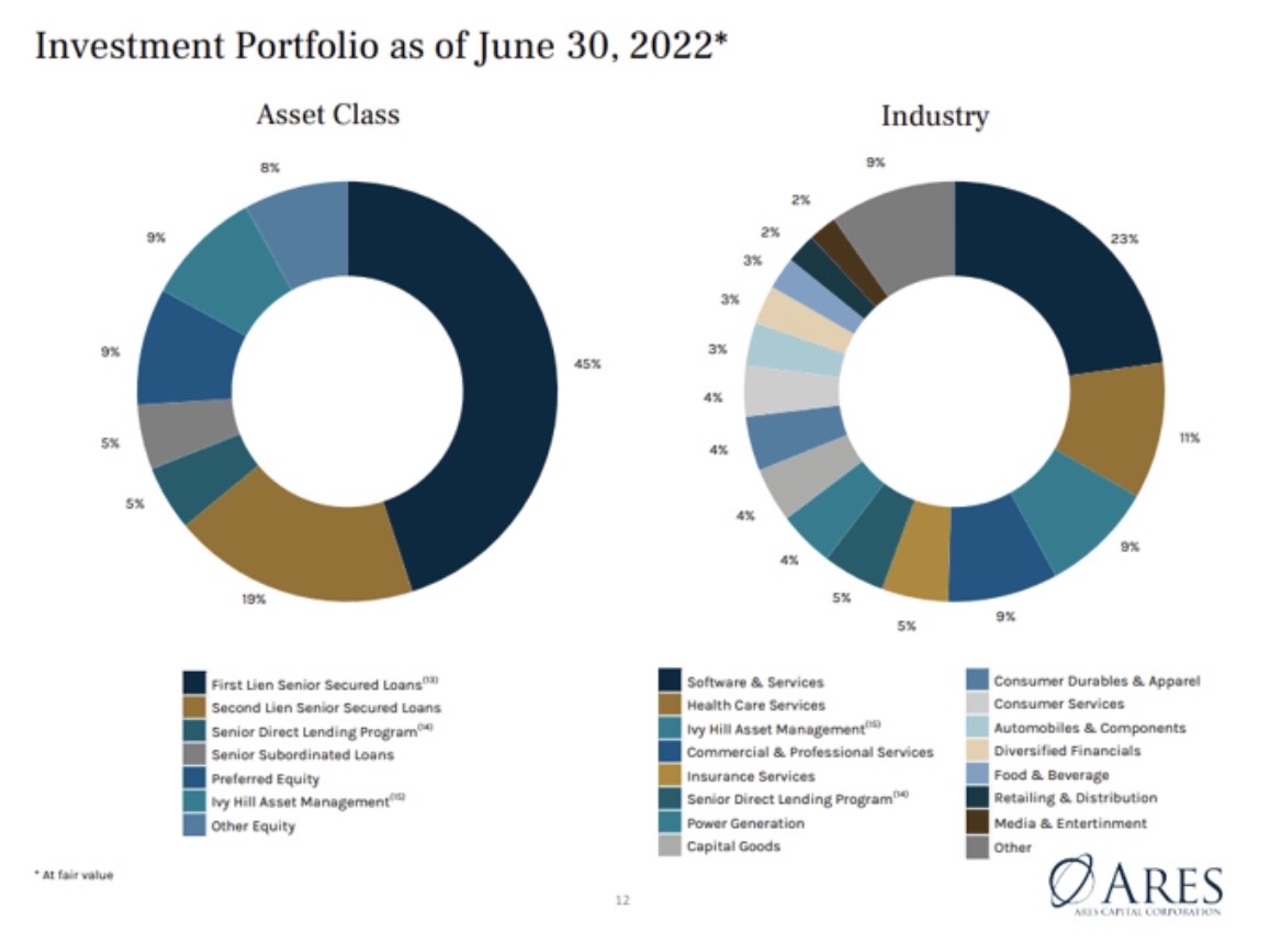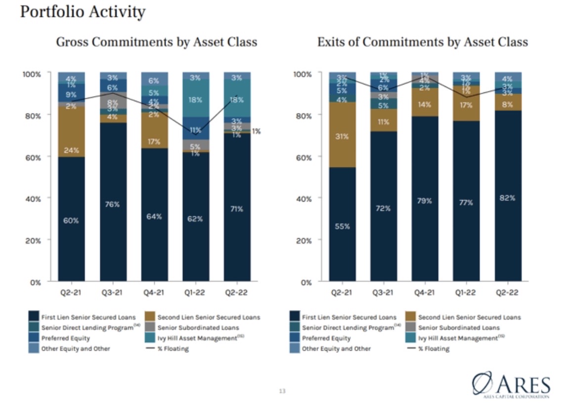 Second Liens' weighting decreased by 2 percentage points from the previous quarter, while the BDC's investment allocation to investment manager Ivy Hill Asset Management increased by 2 percentage points. As of June 30, 2022, the total value of Ares Capital's investments was $21.7 billion.