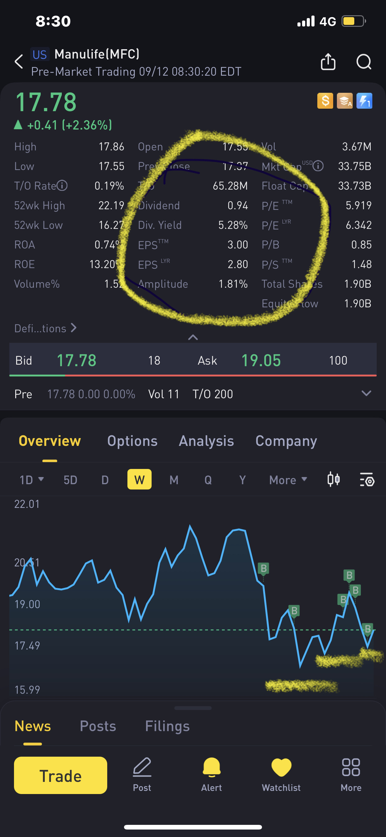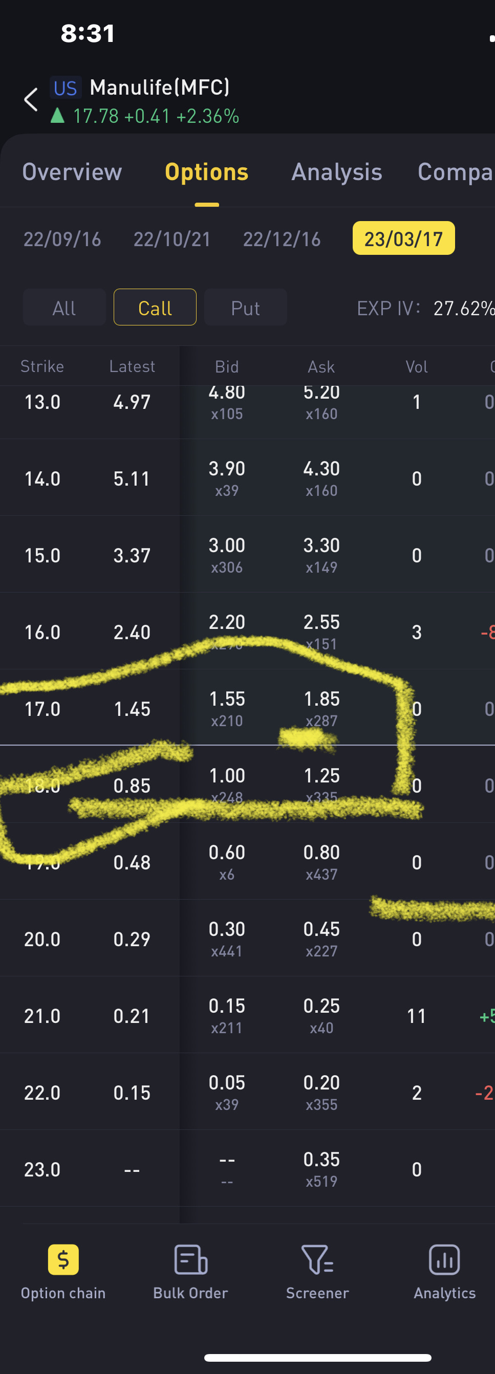Let's say we buy 100 shares of Manulife now at 17.55 and sell call at 6 months taking a premium of 1.80 lowering the cost to $15.88