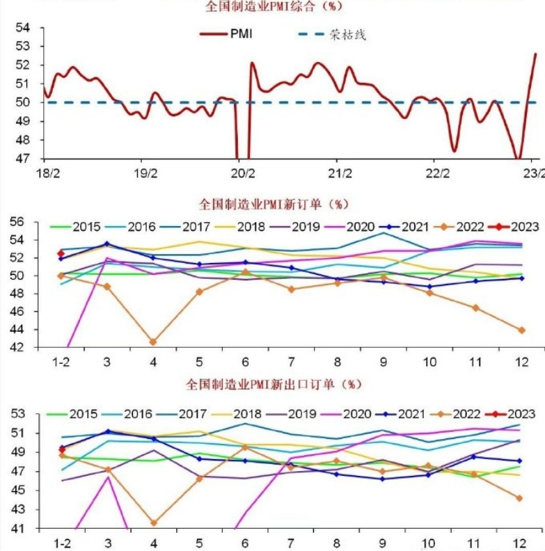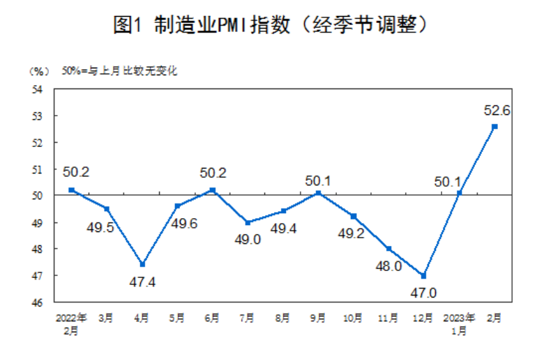今年以來,經濟先行指標PMI持續釋放積極信號。國家統計局3月1日公佈的數據顯示,2月,製造業採購經理指數、非製造業商務活動指數和綜合PMI產出指數分別為52.6%、56.3%和56.4%,高於上月2.5、1.9和3.5個百分點,三大指數均連續兩個月位於擴張區間。高於臨界點,製造業景氣水平繼續上升。