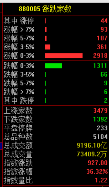 兩市共3479只個股上漲,1392只個股下跌。