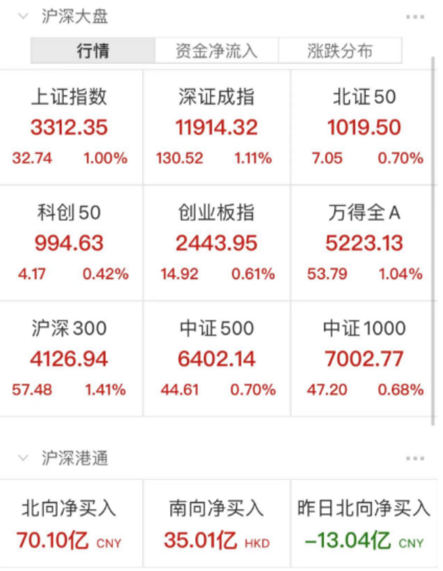 三大指數今日低開高走,滬指午後漲超1%,突破3310點,創出本輪反彈以來新高。截止收盤滬指漲1%,深成指漲1.11%,創業板指漲0.61%。