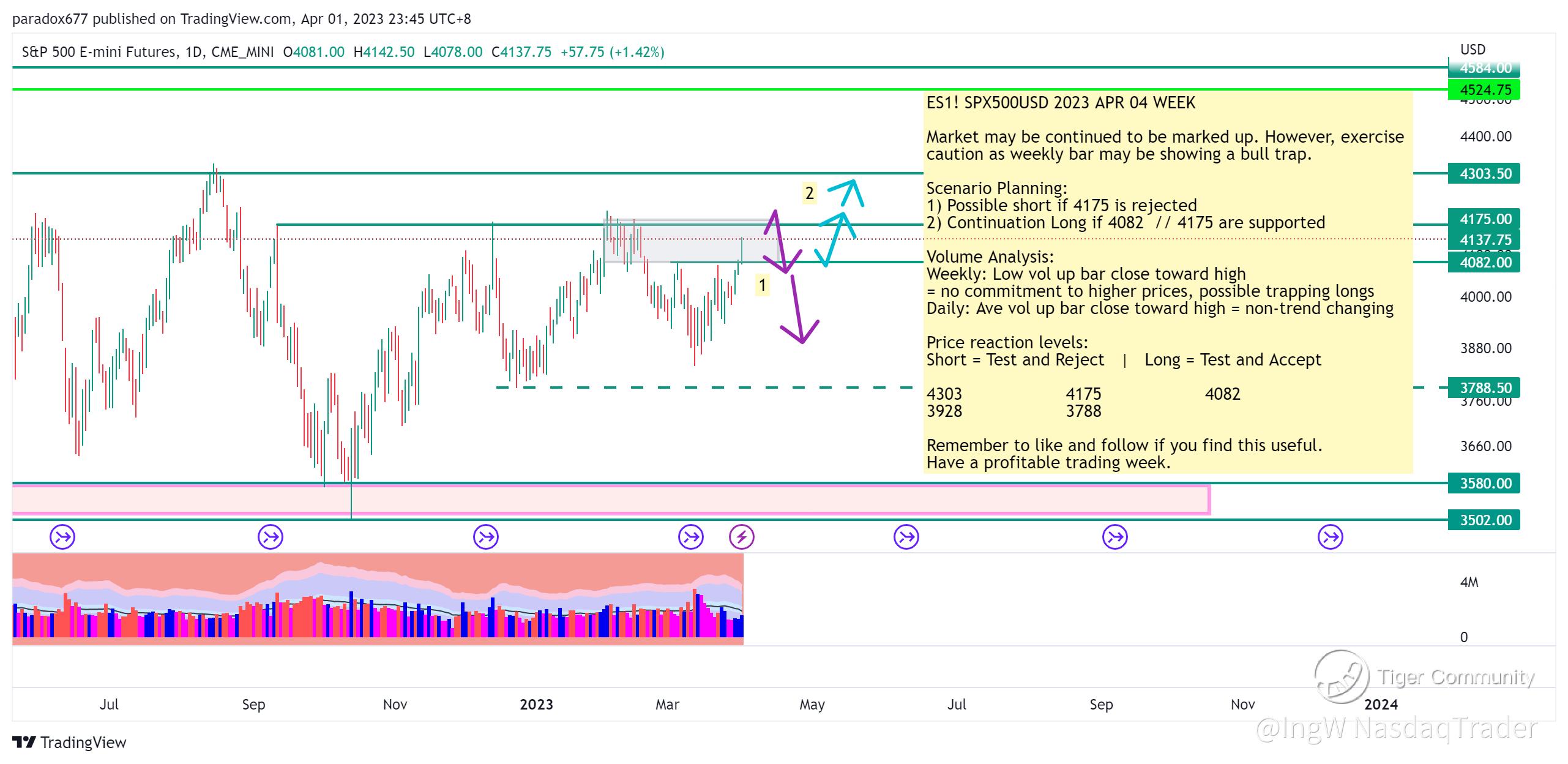 Weekly: Low vol up bar close toward high = no commitment to higher prices, possible trapping longs