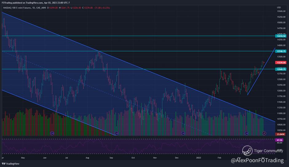 With interest rate hike cycle coming to the end, there might be more rooms for Treasury yield to go lower. This will benefit growth stock so Nasdaq $E-mini Nasdaq 100 - main 2212(NQmain)$ might outperform Dow $E-mini Dow Jones - main 2212(YMmain)$ again, adding to the gap built in Q1. Recession fears is not friendly to most of the commodities (except gold), and any big change on War might mean a lot to many cyclical commodities such as oil, natural gas, nickel and more.