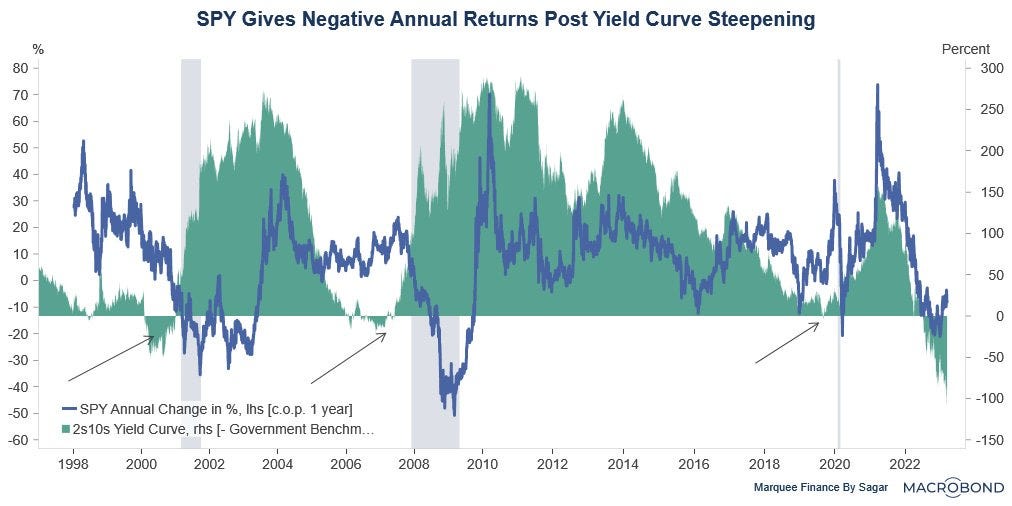 Nevertheless, the historical precedence indicates that as the curve steepens from a deep inversion, S&P logs a negative annual return post the steepening.