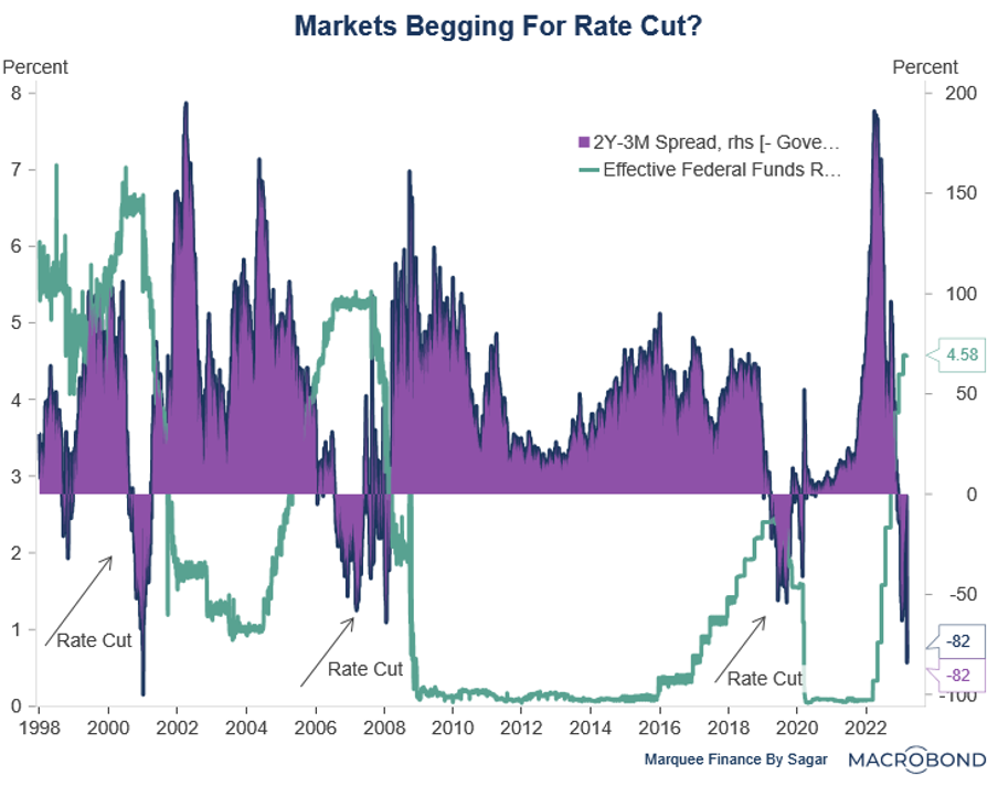 - Rates Trajectory: Fed would most likely halt next week after the 25 bps hike. However, the markets are pressuring the Fed for rate cuts. Whenever the 2Y-3M spread has turned this negative, the Fed cut rates in the next 3–6 months.