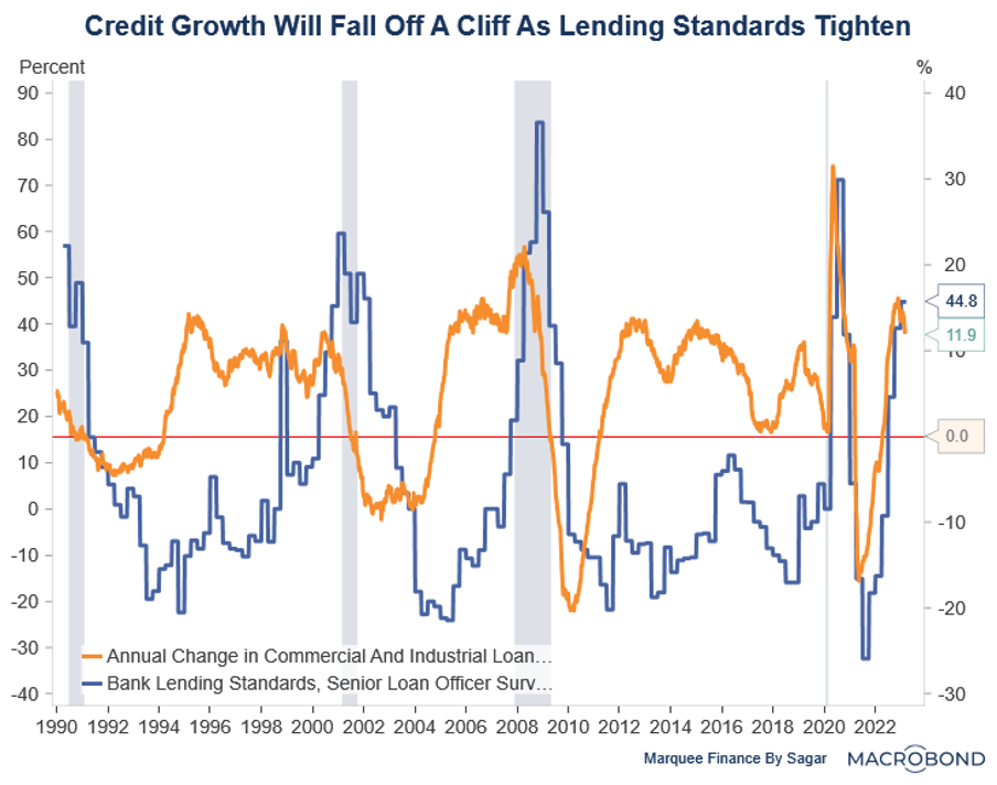 Nevertheless, the regional banks’ fallout implications will be tighter lending standards. Undoubtedly, as the lending standards tighten, the flow of credit to the economy will collapse, and we will see a material slowdown in growth.
