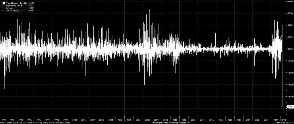 The Credit Suisse saga further elevated the turmoil in the European bond markets as the German 2Y witnessed the highest volatility since the 1980s.