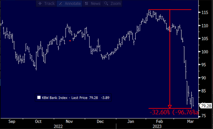 The KBW Bank Stock Index$KBW Bank Index(BKX)$ has lost about one-third of its value in the last five weeks.