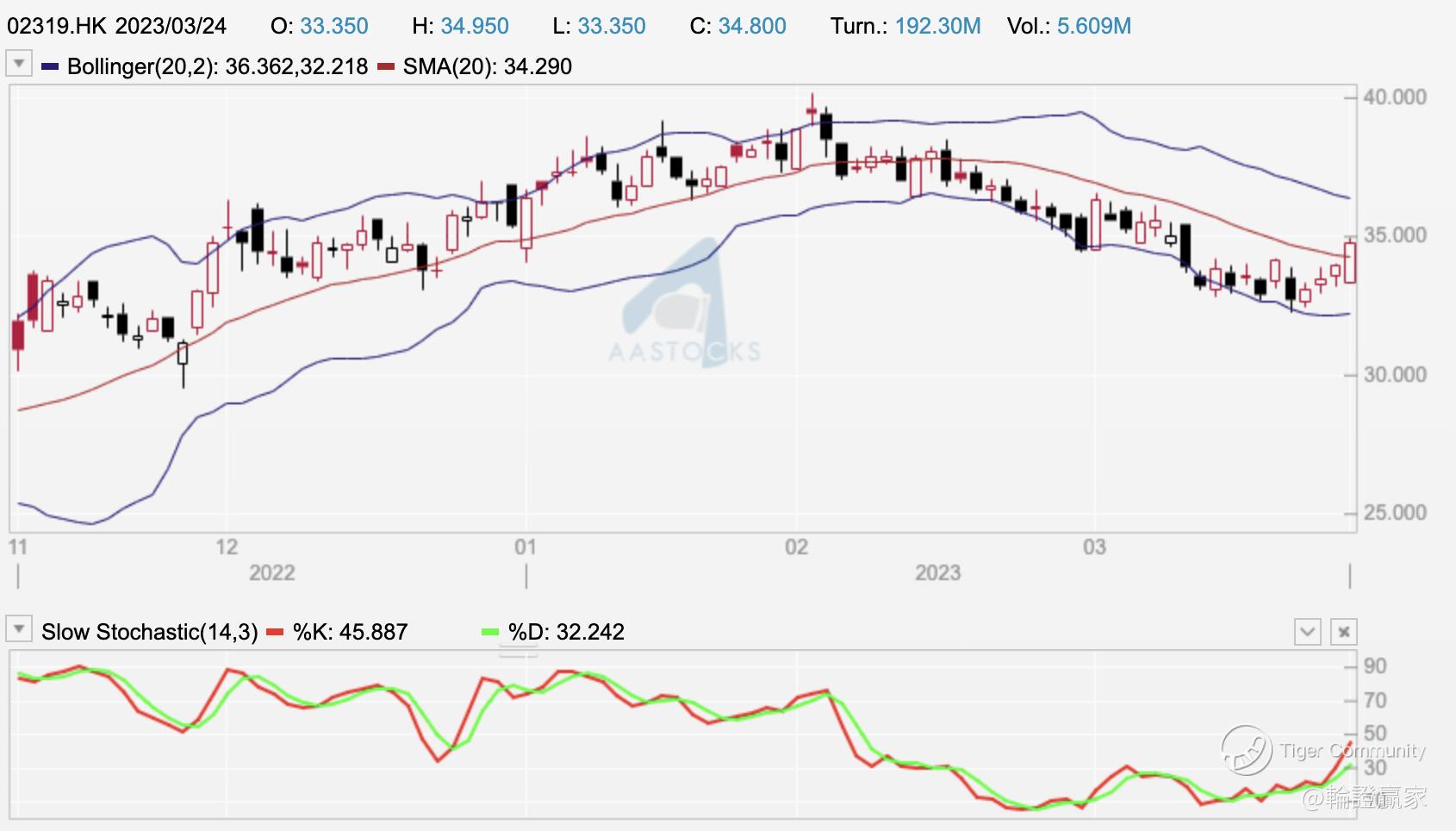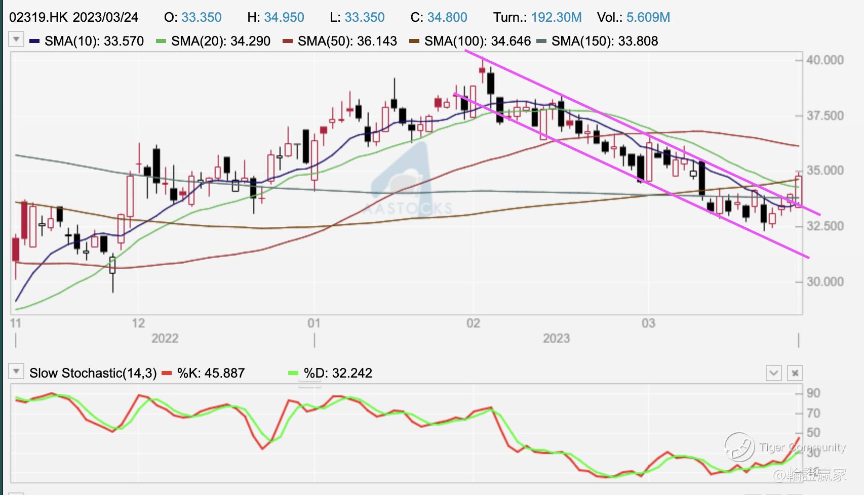 本來想睇平保(02318),但撳錯咗隔離一個掣,睇咗 $MENGNIU DAIRY(02319)$ ,轉角果然係會遇到愛,蒙牛今日憑住一支陽燭撐穿咗由2月初至今嘅「下降通道」,今日支陽燭仲一口氣剷上10、20、100及150天線,Slow STC(14,3)兩線亦未上到天花板,換保歷加通道睇見整條保歷加通道雖然下行,符合股價同Slow STC(14,3)有觸底回升嘅可能,問題在於中軸企唔企得到上去啫,可以book mark。