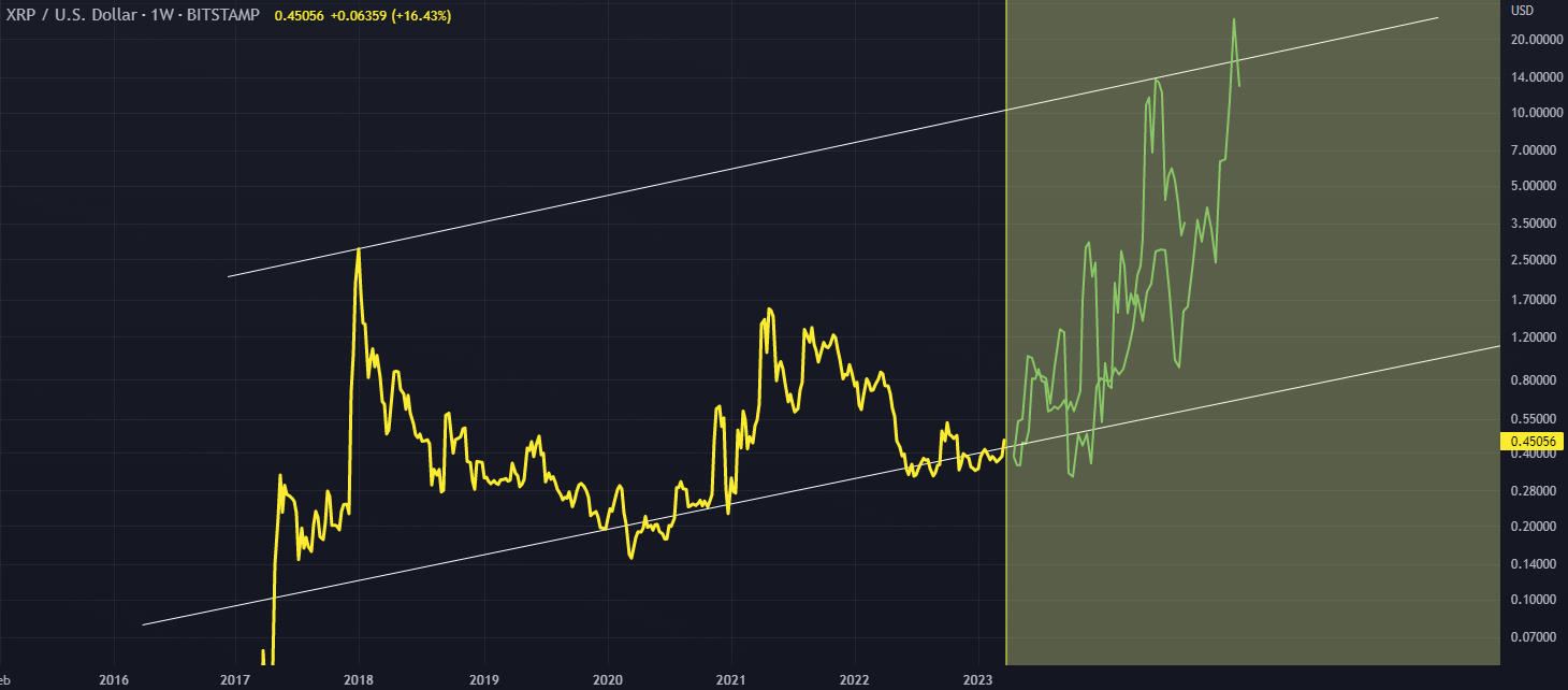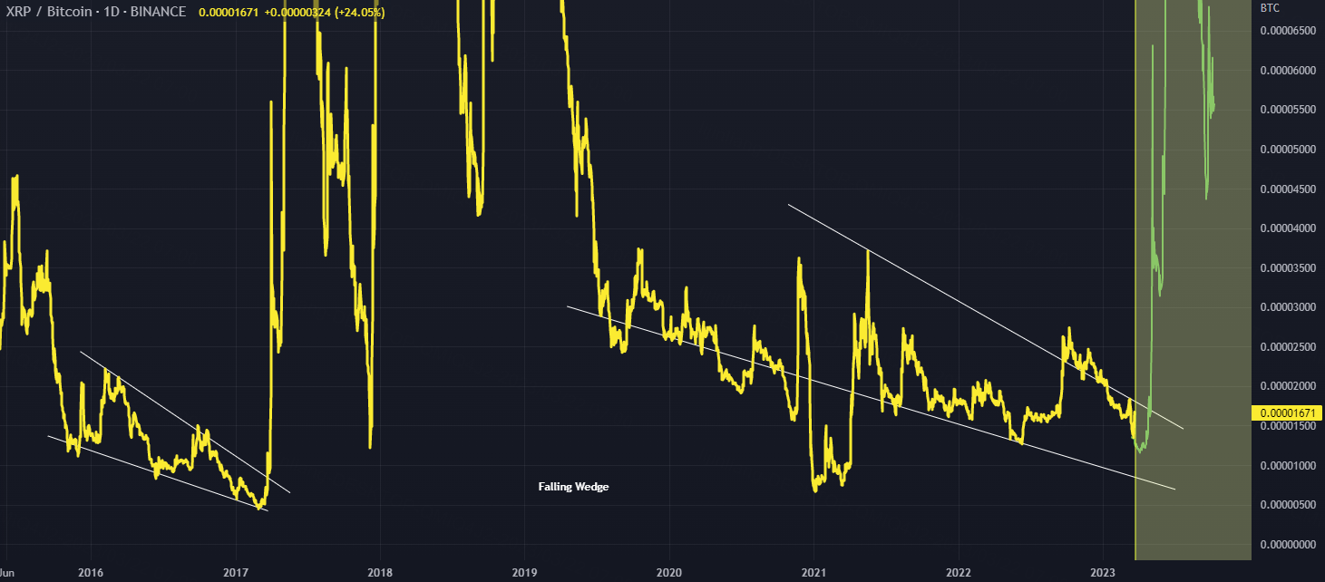Similar falling wedges have presented themselves on the BTC chart for XRP
