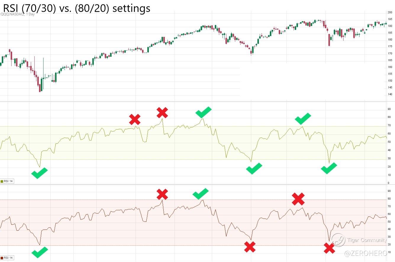 The first RSI in yellow uses the (70/30) setting with a 14-day period while the second chart uses the (80/20) setting for overbought and oversold on the same 14-day period timeframe setting.