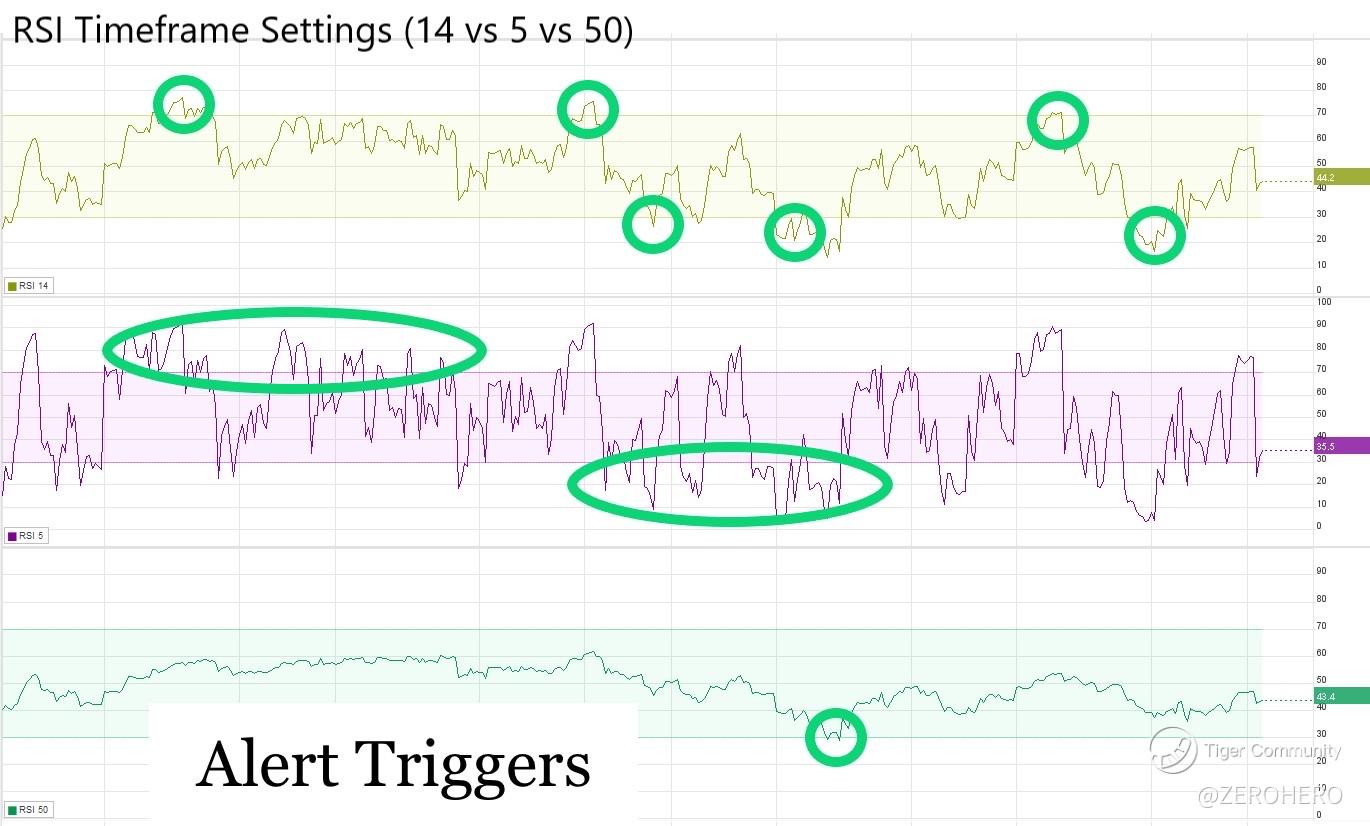 Looking at the chart below, you can compare a 14-day RSI vs. 5 day RSI vs. 50 day RSI setting.