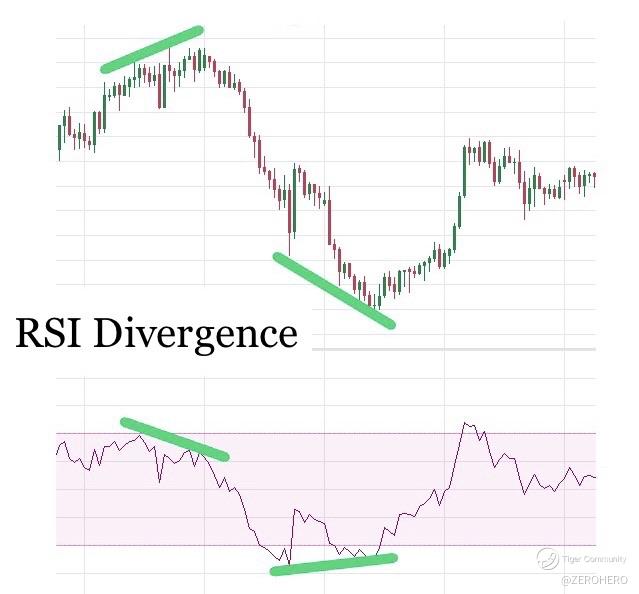 In the chart below, the price continues to rise but the RSI indicator starts to fall from an overbought position. This is known as bearish divergence. After the price falls following the indicator's signal, the indicator starts to point higher in what is called bullish divergence.