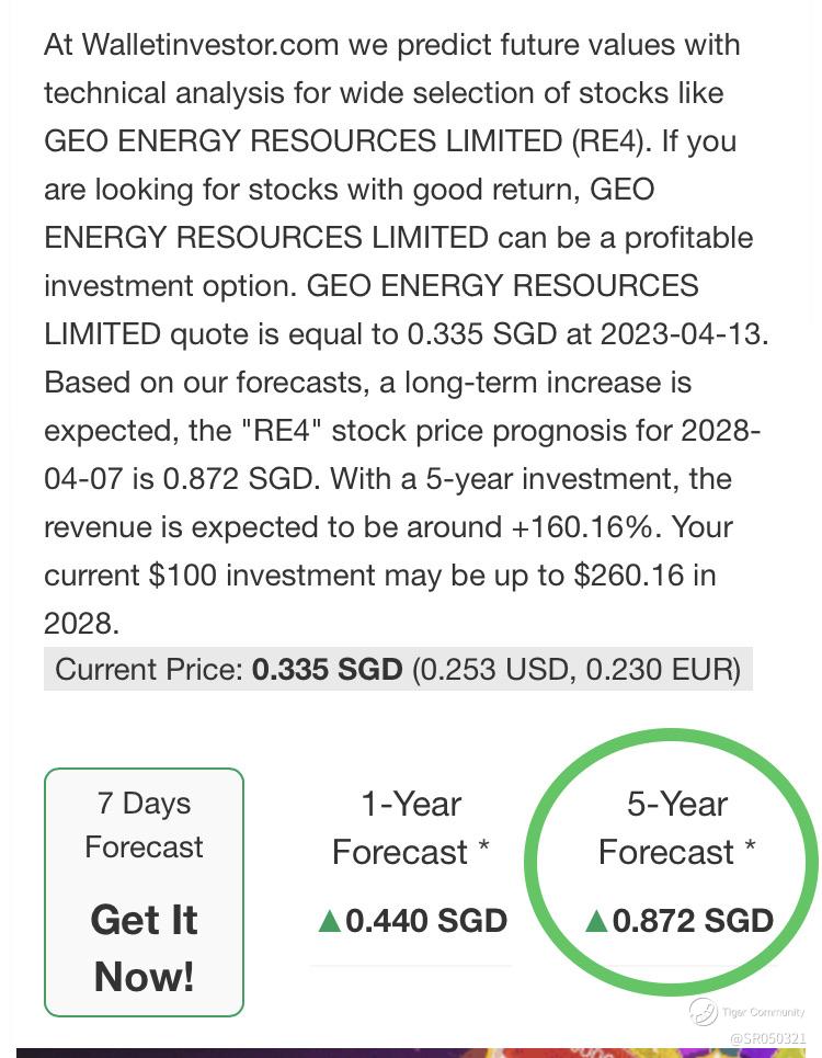 Geo Energy Resources share price forecast for 2023? The analyst consensus target price for shares in Geo Energy Resources is SG$0.40. Actually i intend to sell some or all if it reach 0.40 but i saw another for the 5 years prediction looks good, i also see for $SINGTEL(Z74.SI)$