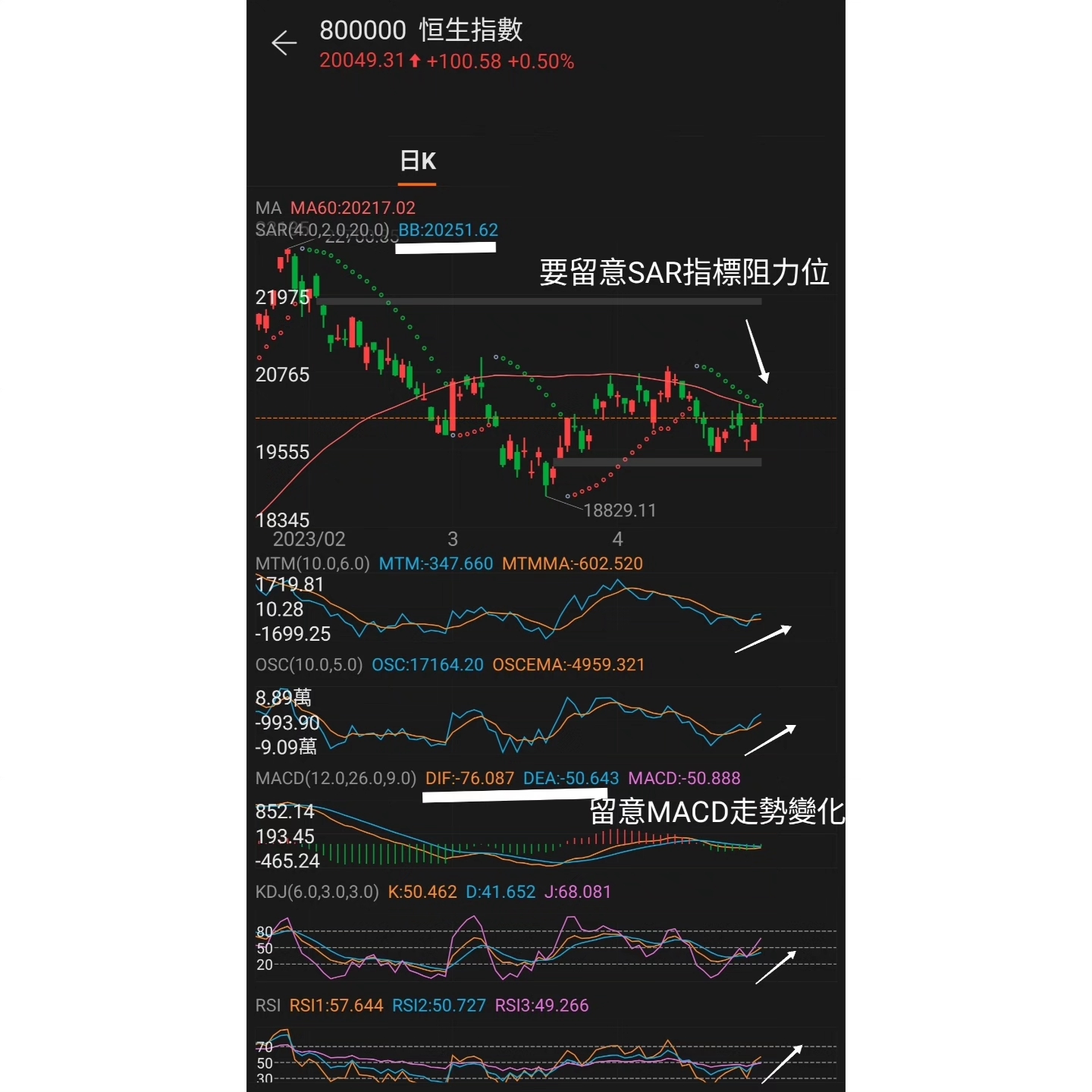 單看技術指標(RSI,MTM,KDJ,OSC)出現金叉,必然會認為恆生指數理應向上升續轉好,但見昨日19900點期指成交分佈圖咁大,又估計期指大戶不會咁進取,所以一心想著開市位應在19900點至20000點機會大,誰知一開市已是20061點,期後更持續上升,直至升近至SAR指標日線阻力位20251點纔回落。