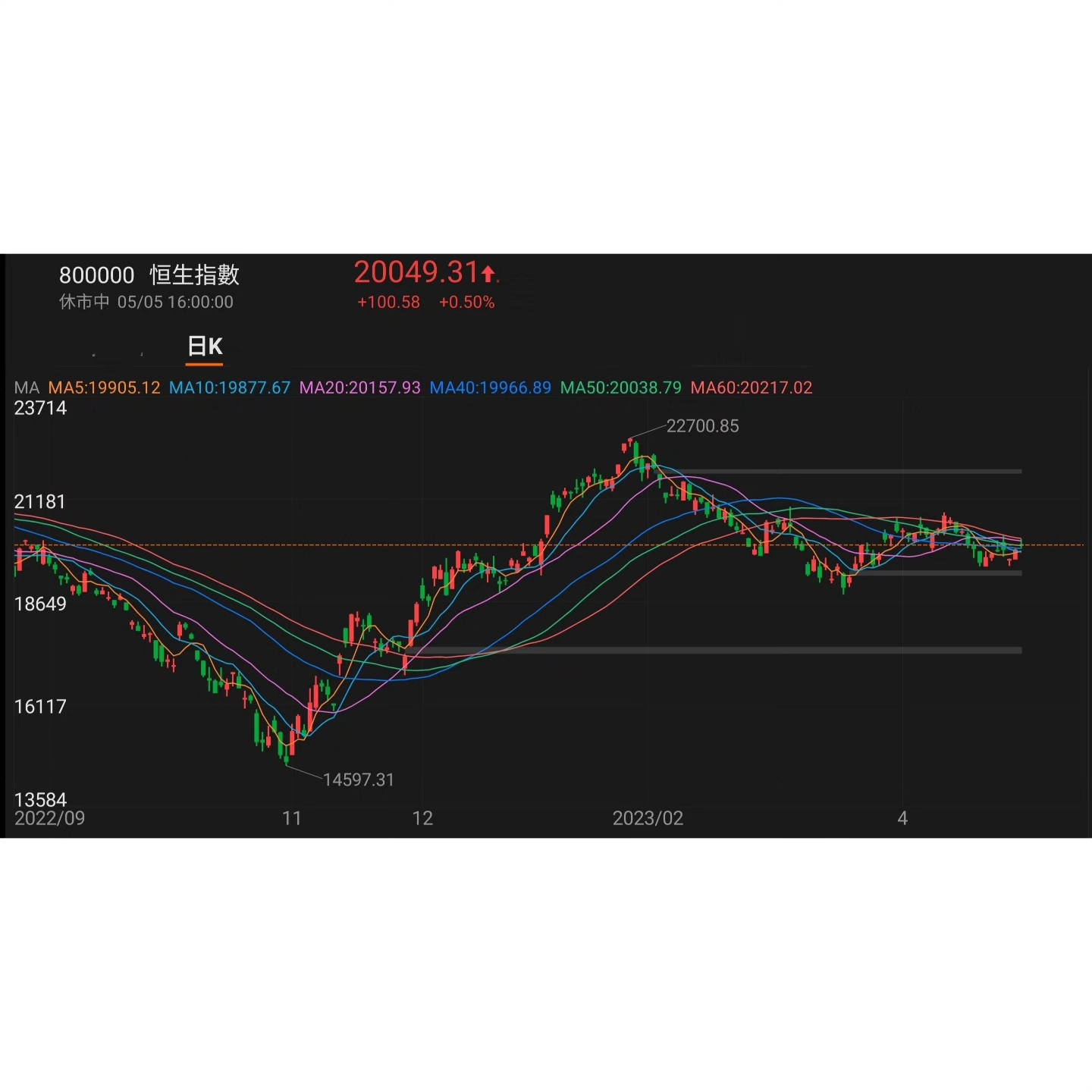 5月5日$恆生指數(HSI)$ 於20061點高開,曾高見20208點,期後向下回落 ,曾低見19968點,全日收報20049點,上升100點,成交額982億。