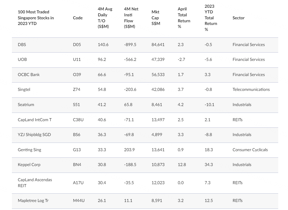 During April, institutions were net sellers of Singapore stocks, with S$261 million of net institutional outflows. This was the least amount of monthly net institutional outflows since net inflows were booked in November 2022. The month of April also saw the STI produce its narrowest percentage trading range since February 2015, which coincided with comparatively less swings in the 10-year US Treasury Note yields.