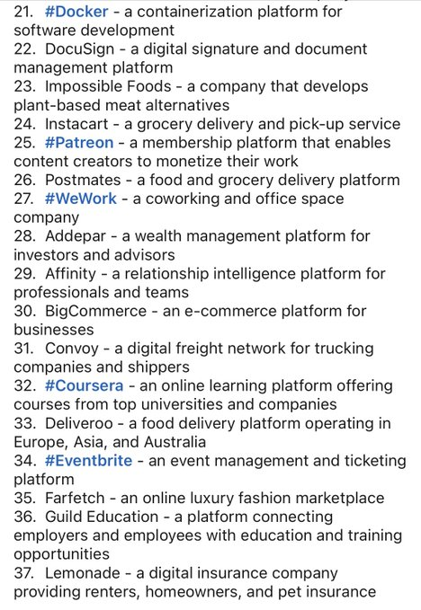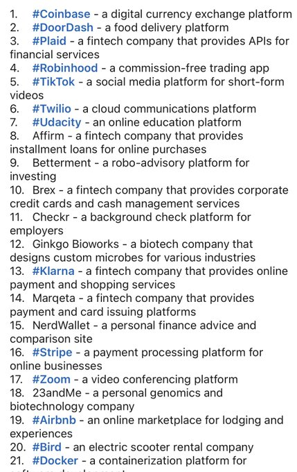 The entire list: $Coinbase Global, Inc.(COIN)$ $DoorDash, Inc.(DASH)$ $PLAID INC.(PLDIF)$ $Robinhood(HOOD)$ $Twilio(TWLO)$ $Affirm Holdings, Inc.(AFRM)$ $Zoom(ZM)$ $Airbnb, Inc.(ABNB)$ List of largest U.S. bank failures.