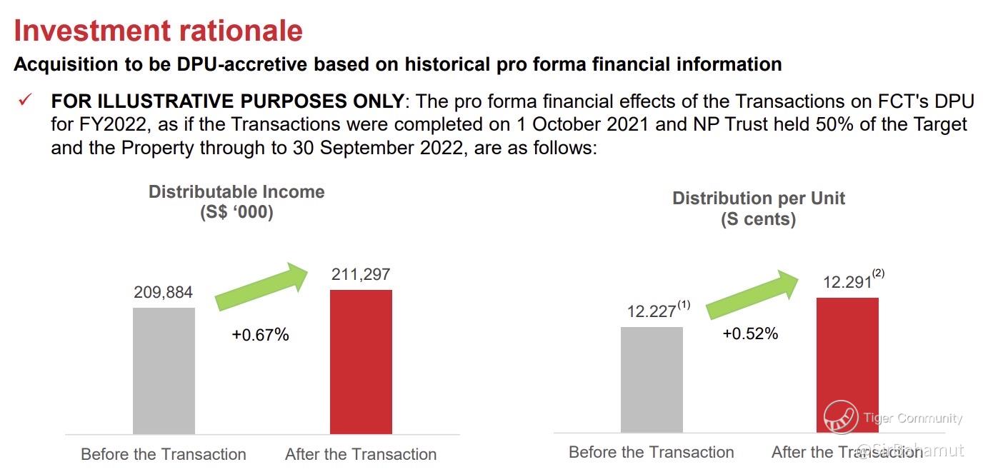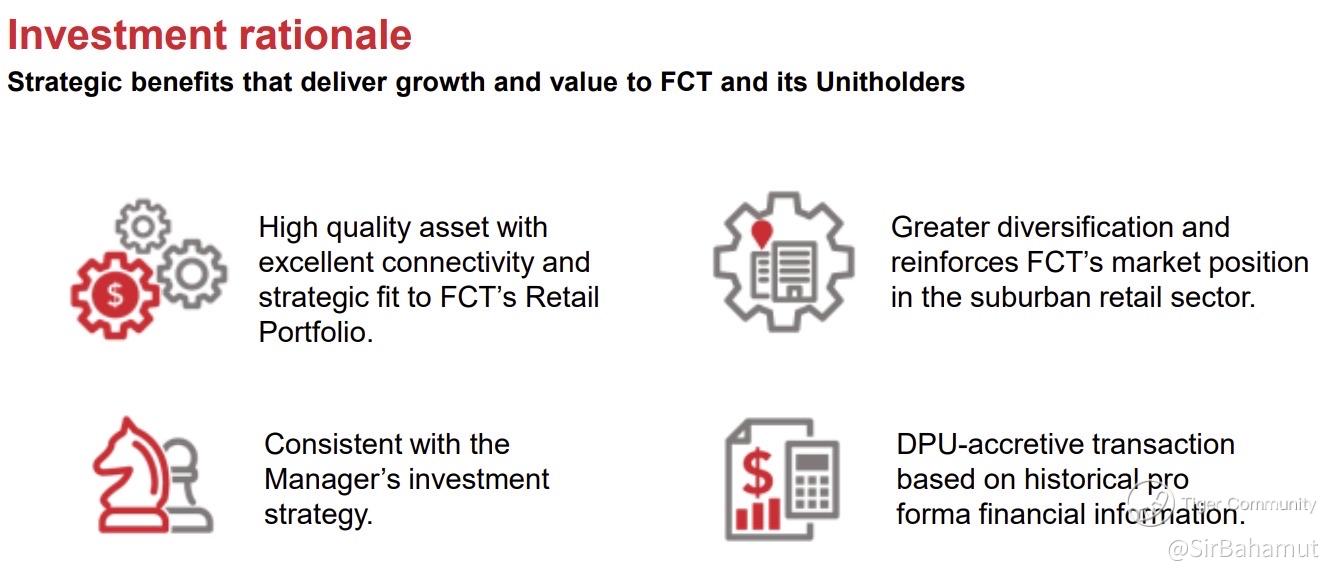 The deal is also expected to be accretive to FCT's DPU, and will be fully funded through cash and debt with the support of the sponsor, with FCT's pro-forma FY22 leverage rising to 38.5% from 33.0%. It is also expected that the market's concerns over a potential equity fundraising by FCT will finally be put to rest.