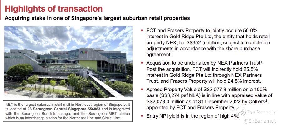 $FRASERS CENTREPOINT TRUST(J69U.SI)$ FCT and FPL announced last night that they will be jointly acquiring a 50% stake in Nex, a suburban retail mall located in Serangoon, Singapore, for a consideration of S$652.5m from Mercatus. The agreed property value for the 100% stake is S$2,077.8m. After the acquisition, FCT and FPL will hold 25.5% and 24.5% stake in the mall, respectively.