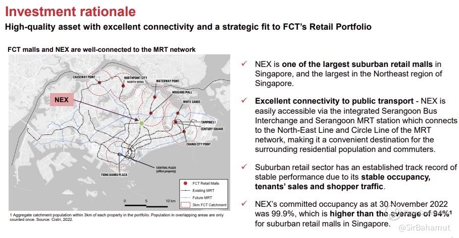 This acquisition will add another trophy asset to FCT’s portfolio, similar to other premier FCT-owned malls such as Northpoint City and Waterway Point! The transaction will solidify FCT's position as the leading player in the suburban retail mall market in Singapore and establish it as the largest owner of suburban retail shopping space in the country. NEX is directly integrated with the Serangoon Bus Interchange and the Serangoon MRT station that serves as an interchange station for the North East Line and the Circle Line.