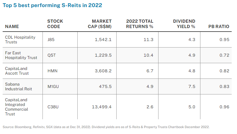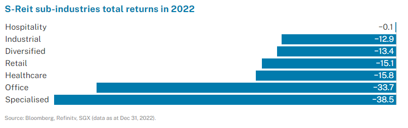 Despite headwinds over the past year, S-Reits reported solid and resilient fundamentals alongside the continued reopening of economies and the return of global travel. Hospitality Reits benefited significantly in 2022 with the rise in international tourist travels and was the sub-industry that saw the strongest performance for the year.