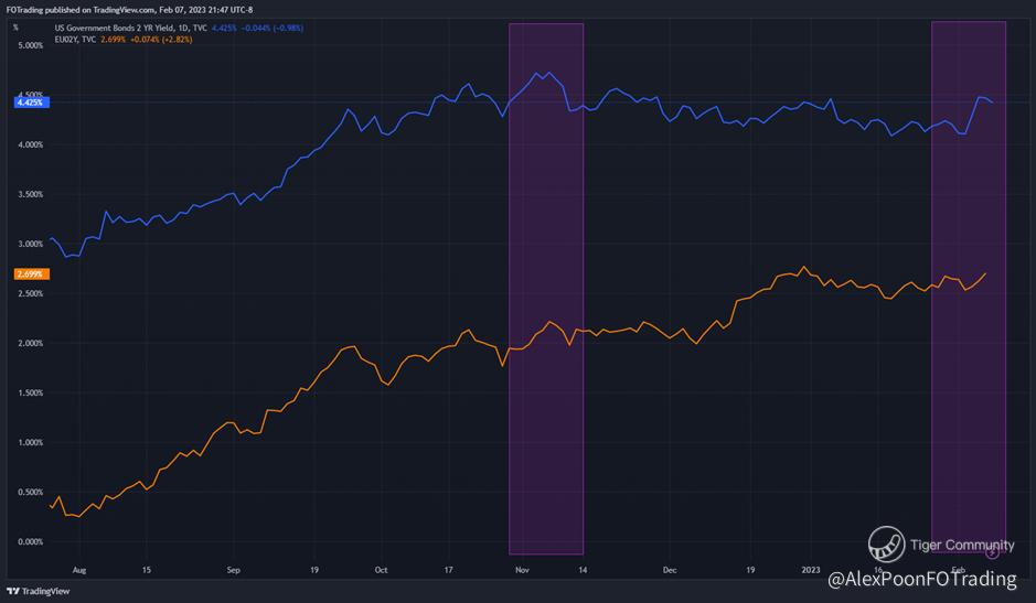 Another interesting area to note is the yield of US 2-year note. The inversion of yield curve is implying a recession, but what if US can avoid recession, especially when the US job market is surprisingly impressive?