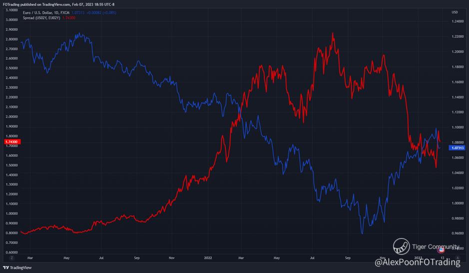 In the meantime, the dollar was on the uptrend against euro and other major currencies. When there was expectation the Fed will slow the hike pace, and ECB was becoming more hawkish to tackle inflation, the yield differential narrowed since Q4 that caused the weakness of dollar.