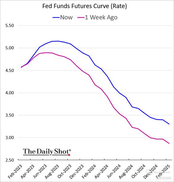 Not only is the Fed's terminal rate futures higher than a week ago, but the pace of expected rate cuts has been delayed by almost three months from the previous week, meaning that the market expects the Fed to bring the terminal rate back down to 4.5% in December before the end of the year, for example, but this expectation has now been delayed and will not be seen until March of 2024.